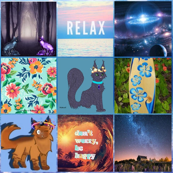 •——————————————— 🐾 ———————————————••Description•» Breed of Cat: LaPerm» Pelt Base: a Russian blue like color» Eyes: jade green» Markings: white speckles (like stars)» Paws: same as pelt» Fur Length: long» Body Structure: lean» Scars: N/A» Disabilities: he's missing his left hind leg (was born without it)» Accessories: Collar with a tiny surfboard on it» Accent: Like a Californian surfer» Personality: Chill and levelheaded, always tried to help any cat his owner took in to foster» Voice: He sounds like a stereotypical surfer dude.•——————————————— 🐾 ———————————————•